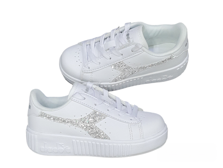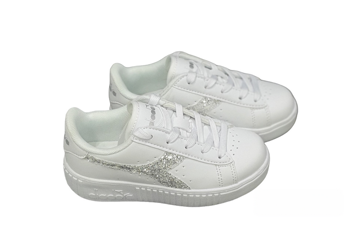 Sneaker bianca con contrasto argento glitterato, con lacci, tomaia in ecopelle, interno in tessuto, suola in gomma.