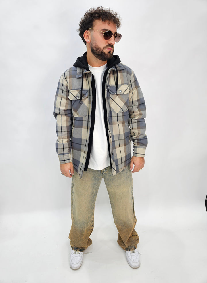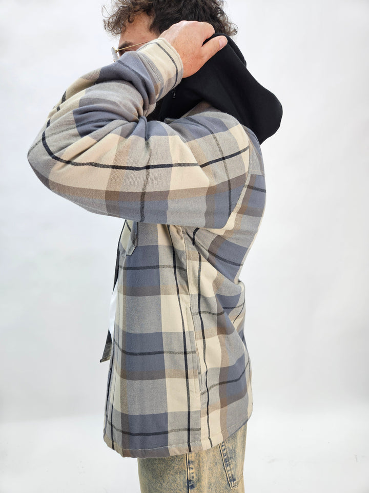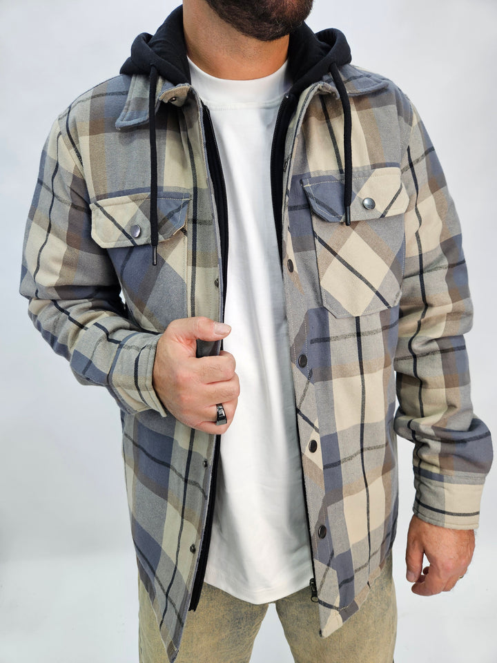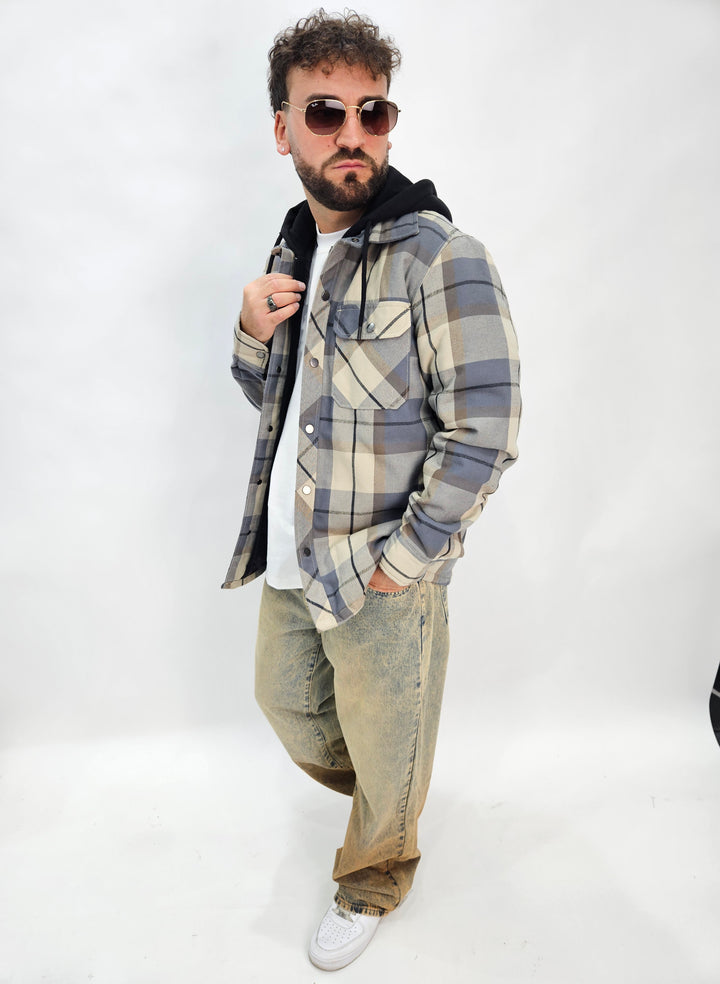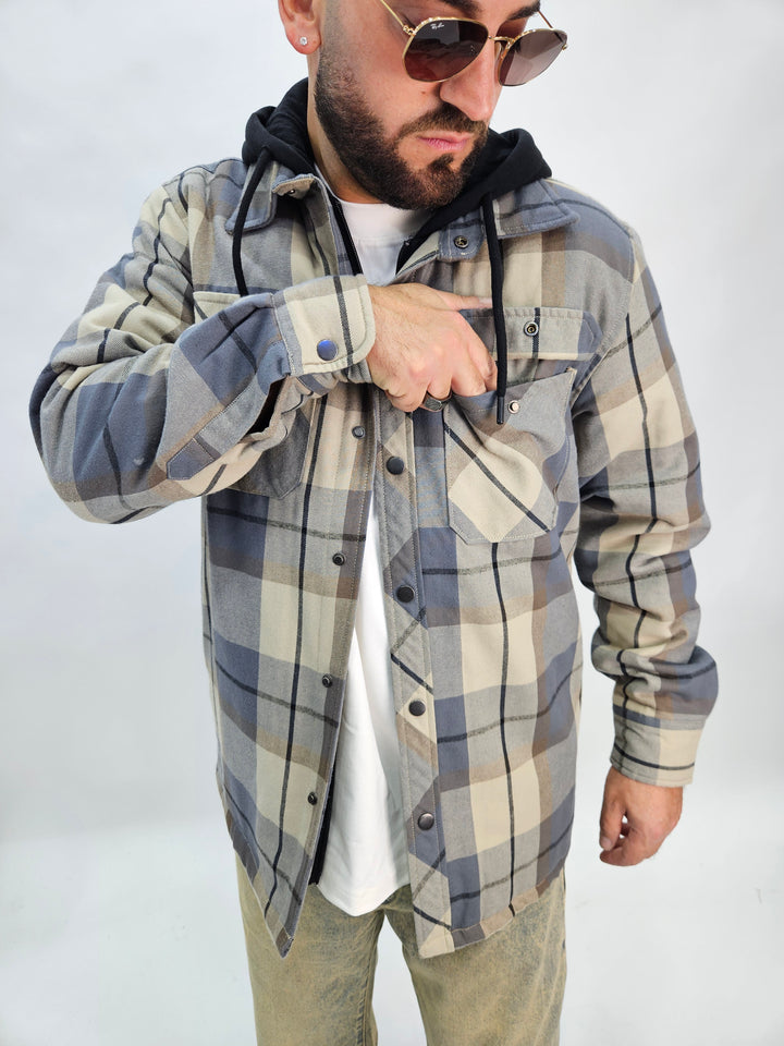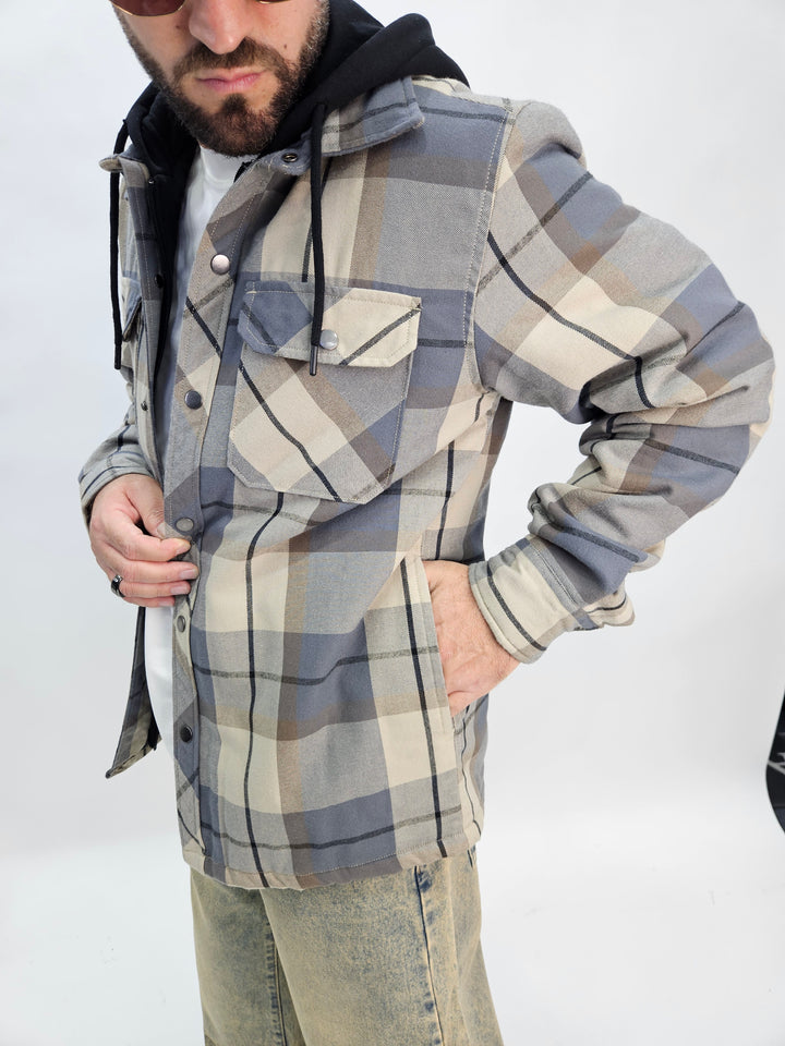 Camicione a giubbino con fantasia a quadri, trapuntato internamente per garantire un piacevole calore, con finta felpa cucita sotto e cappuccio.