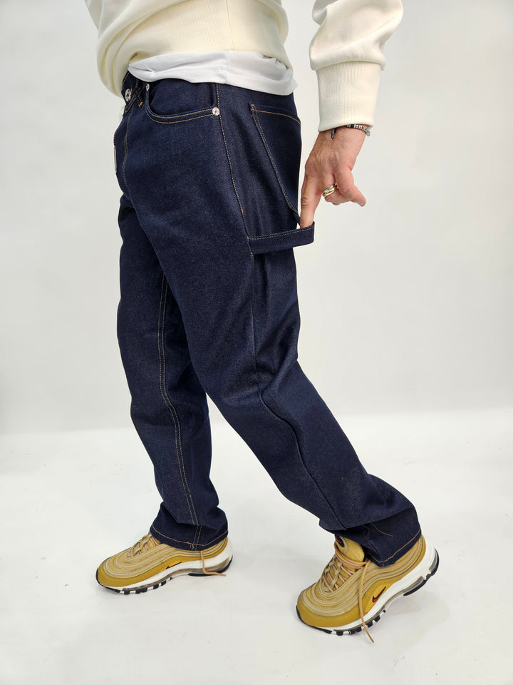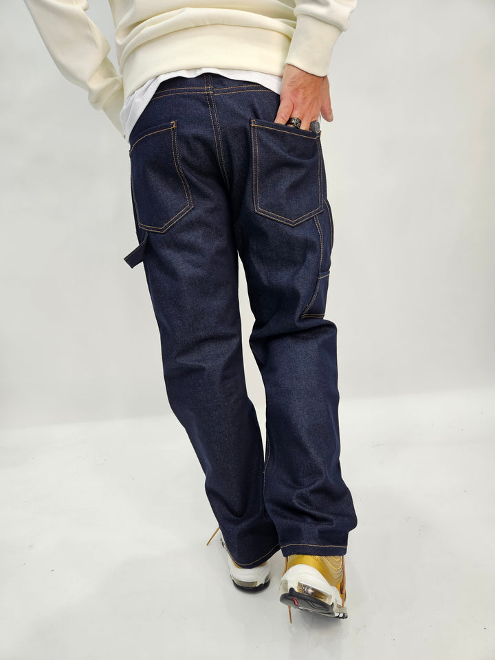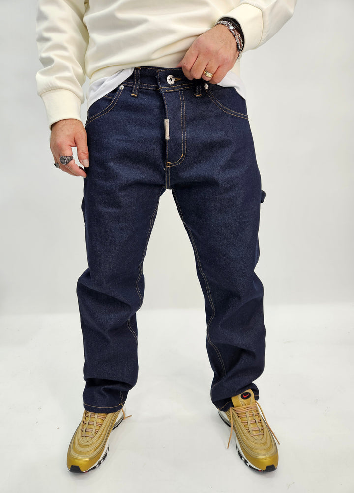 Jeans baggy su tela premium quality, con lavaggio scuro e tasconi laterali che accentuato la particolarità del jeans.