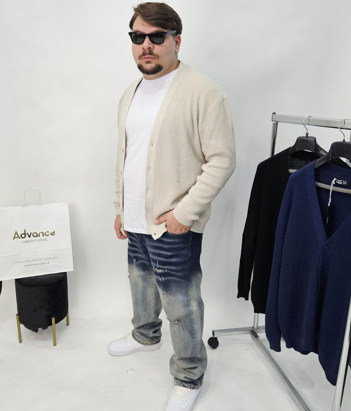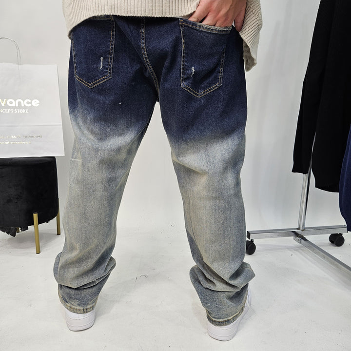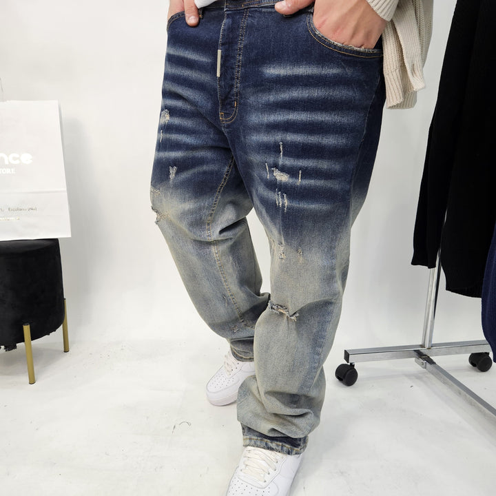Baggy bicolor sabbiato, vestibilità over-fit, fondo a palazzo