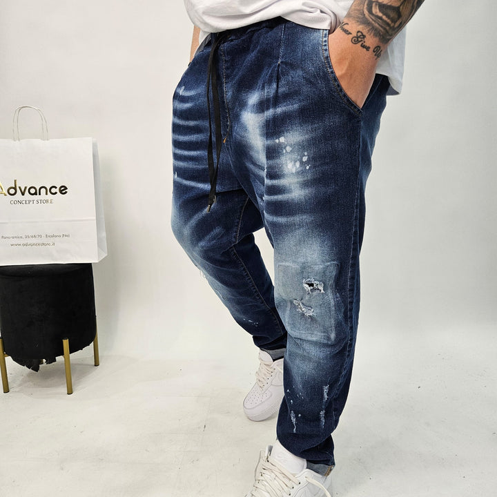 Pantalaccio jeansato, con elastico in vita, e lacci a corda, vestibilità regular