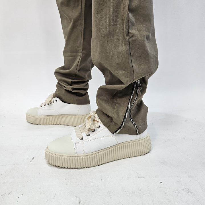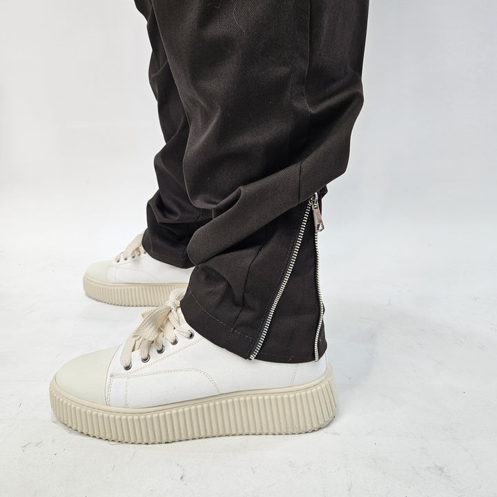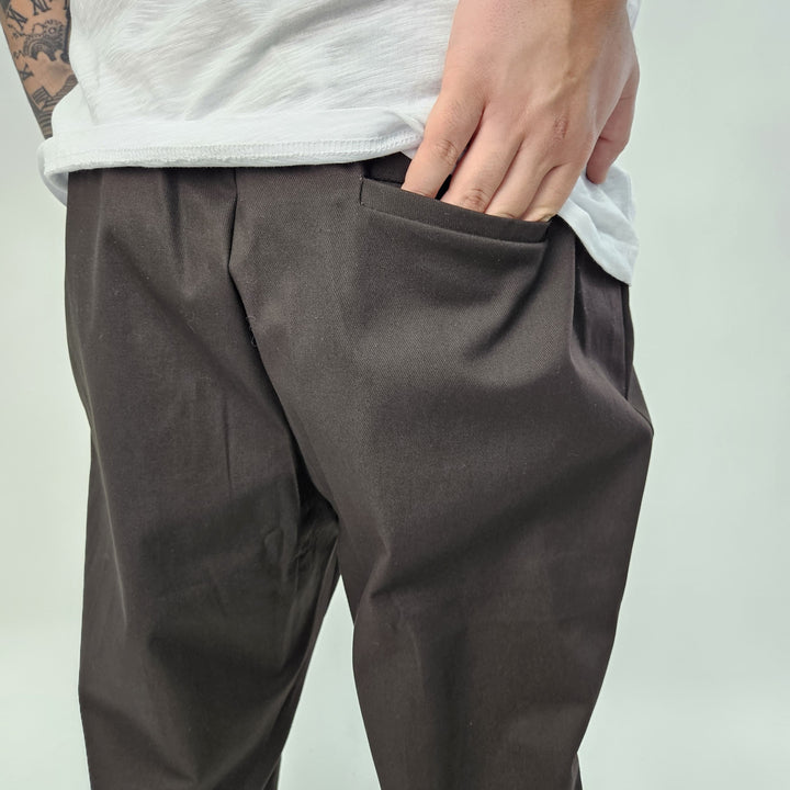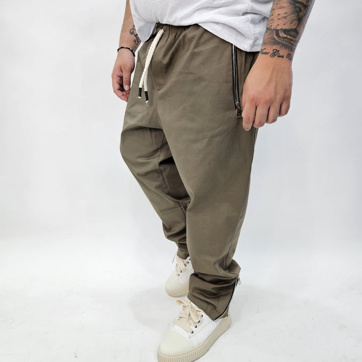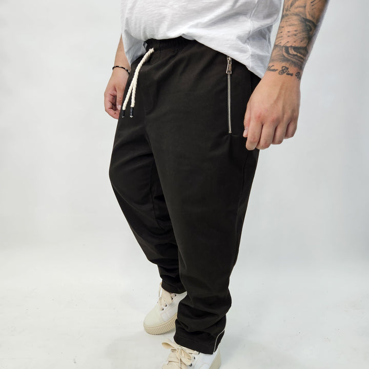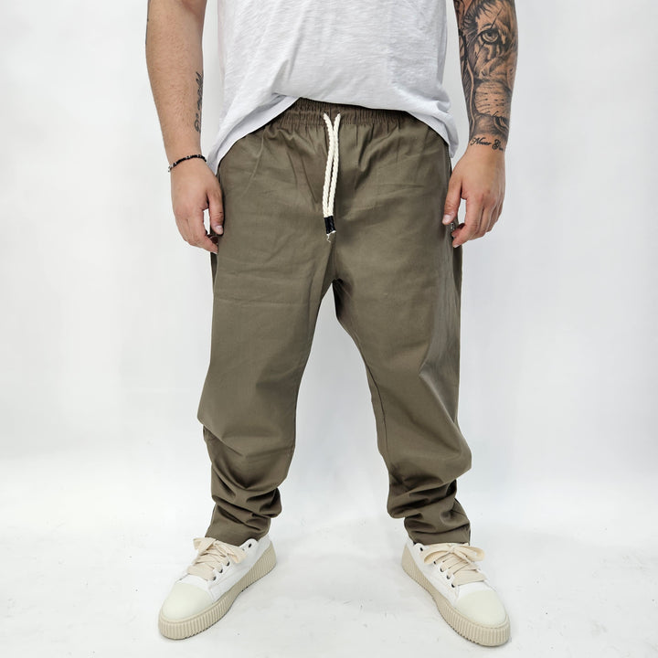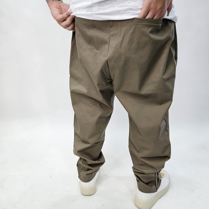 Pantalaccio in tessuto Gambardina diagonale con laccetto regolabile in corda - tasche con chiusura zip - e zip sul retro per regolare la vestibilità